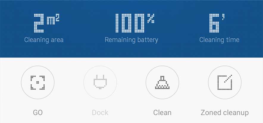 Информация о пройденном расстоянии, временной диапазон уборки, уровень заряда батареи в нижней части экрана.Там же можно начать или прекратить уборку.