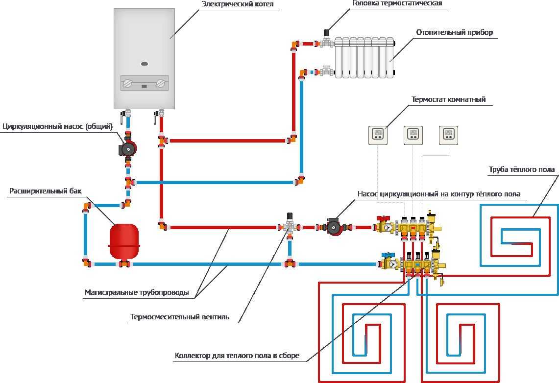 Схема отопления с электрокотлом и теплыми полами. Для развода теплых полов на несколько контуров используются гидроколлекторы.