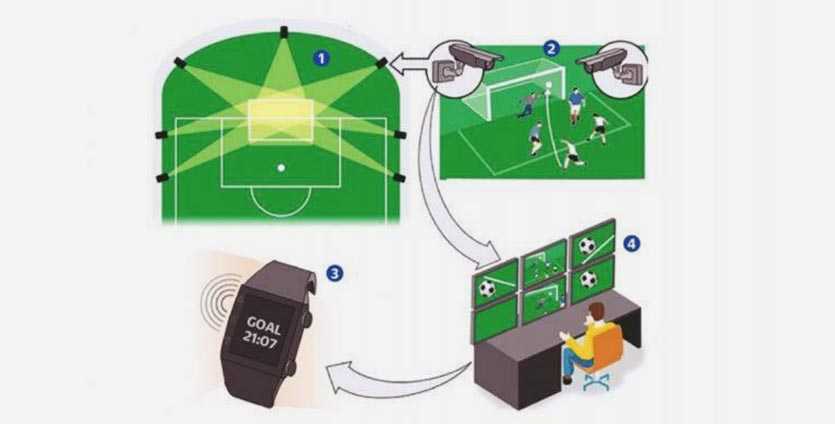 Вокруг ворот каждой из команд устанавливалось по 7 высокоскоростных камер, которые отслеживают положение мяча. Камеры могут достаточно точно фиксировать пересечение линии, а блок управления отправляет сигнал на вибрирующие наручные часы главному арбитру матча.