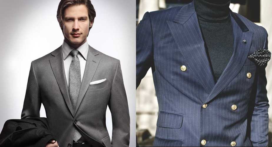 Двубортный – это более официальная строгая модель для официальных мероприятий. Пуговицы на пиджаке располагаются в два ряда, полы имеют глубокий запах. Правило ношения – пиджак застегивается на все пуговицы. Отлично смотрится на высоких худощавых мужчинах.