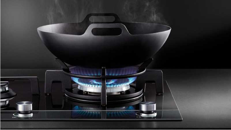 - Экспресс-конфорка WOK. Некоторые продвинутые модели варочных панелей имеют по одной экспресс-конфорке WOK. Она представляет собой мощную горелку с двойной или тройной короной и адаптером для вок-сковороды (со сферическим дном). На самом деле она достаточно универсальна и удобна просто для готовки в любой большой посуде.