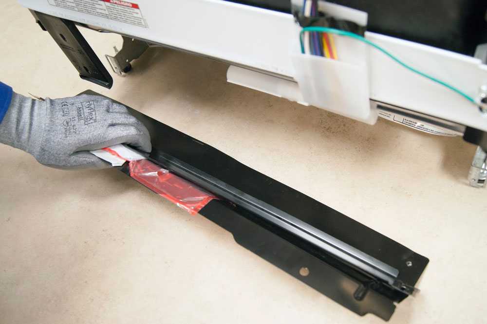 Снимите нижнюю переднюю панель доступа и ударную пластину. Используя гайковерт, снимите винты, удерживающие переднюю панель доступа и ударную пластину на месте. Потяните панель доступа и ударную пластину на себя, а затем выньте их и отложите в сторону.