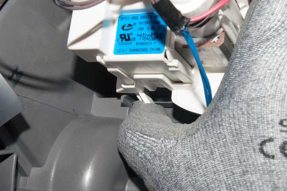 Снимите дренажный насос. При необходимости воспользуйтесь плоскогубцами. Подстелите полотенце, чтобы при необходимости собрать воду. Отсоедините сливной шланг из сливного насоса. Уберите жгут проводов из дренажного насоса. Нажмите вниз на фиксатор, а затем поверните насос на четверть оборота против часовой стрелки, чтобы вытащить его из картера. Если вы не можете получить доступ к сливному шлангу и насосу при снятых панели доступа и ударной пластине, вытащите посудомоечную машину из ниши. Обратитесь к Руководству по установке для вашей посудомоечной машины для дополнительных разъяснений.