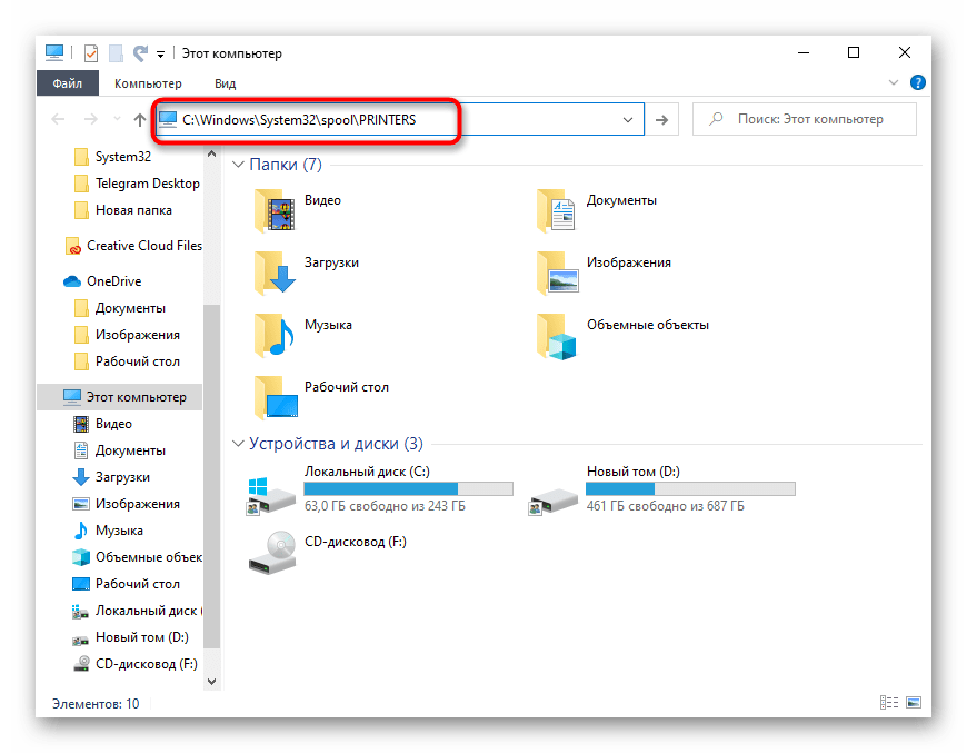 Перейдите к «Проводнику» и вставьте в адресную строку путь C:WindowsSystem32SpoolPRINTERS .