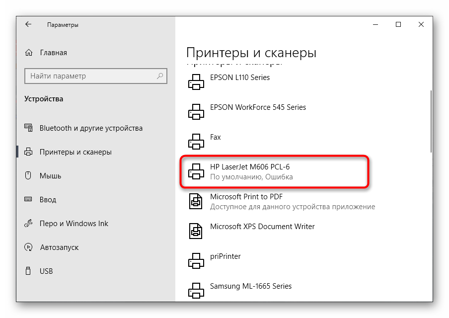 Далее появляется список подключенных и ранее использованных принтеров. Если работа производится в офисе, важно точно знать, на какое устройство был отправлен файл. Если же вся процедура проходит в домашних условиях, активный принтер наверняка будет помечен галочкой как используемый по умолчанию.