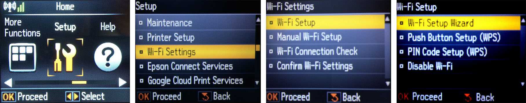 На WiFi принтере при помощи клавиш навигации войдите в пункт «Wi-Fi Settings», или «Беспроводные подключения». Потом в данном разделе, выбираем способ соединения «WPS».