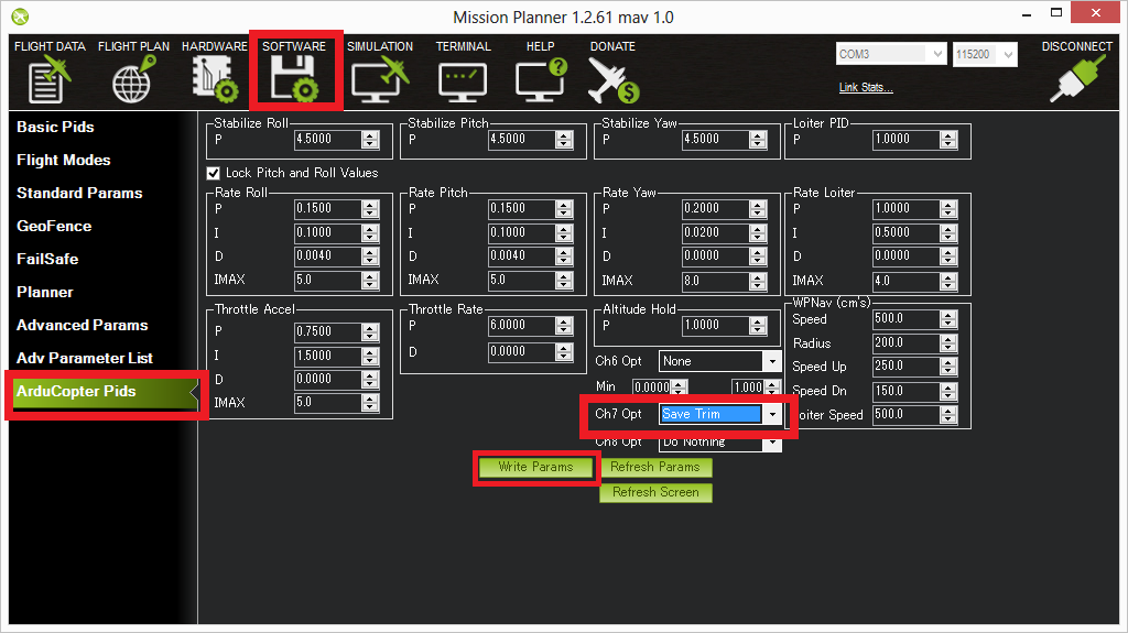 Для систем, построенных на платах Ardupilot, предлагается программное обеспечение для изменения полетных параметров. Перед тонкой калибровкой, требуется задать начальные настройки регуляторов. Это делается следующим образом: