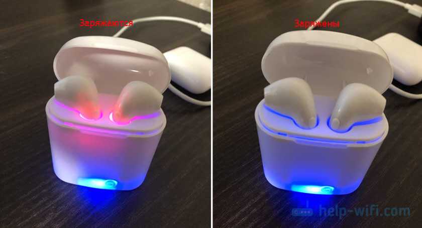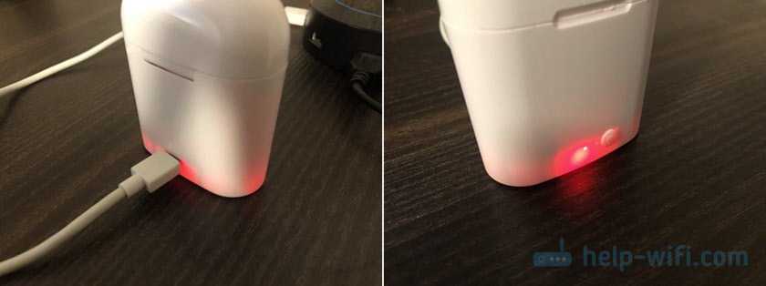 О том, что наушники начали заряжаться обычно можно понять по изменившемуся состоянию индикатора на кейсе, внутри кейса, наушниках. Он либо начинает мигать, либо меняет цвет. Так, например, когда наушники заряжаются, индикатор на кейсе может гореть синим цветом, или зеленым. А когда заряжены – индикатор гаснет. А наушники в процессе зарядки могут подсвечиваться красным цветом.