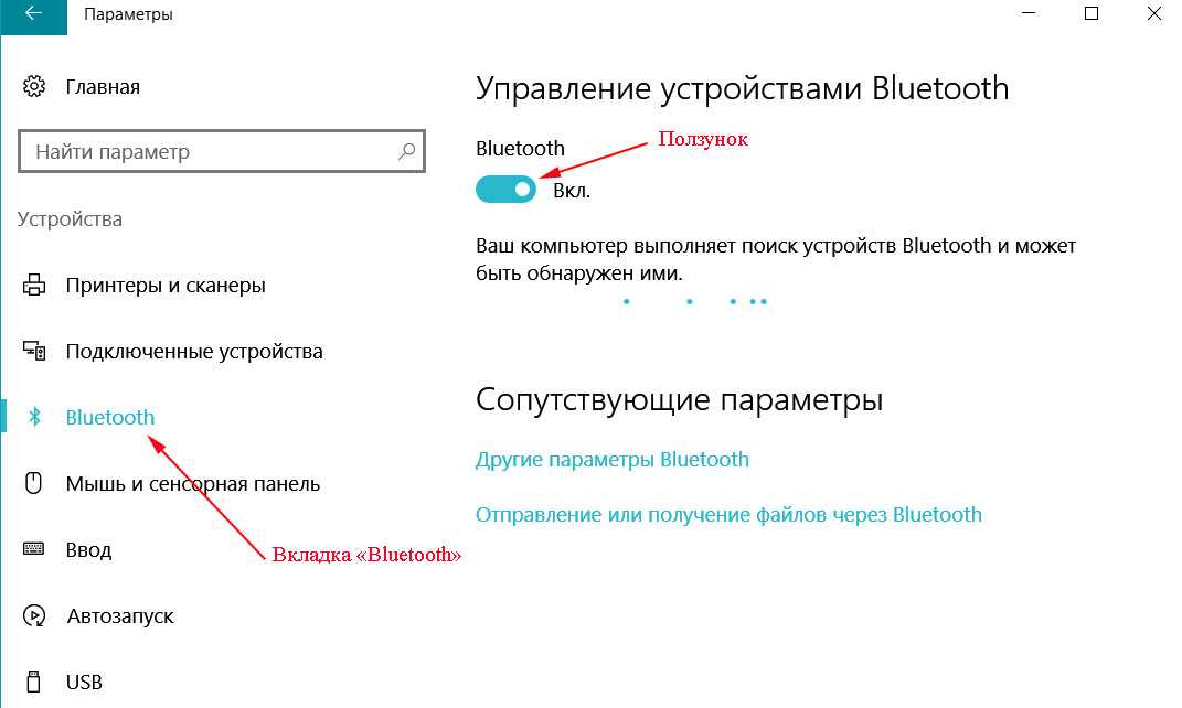 Вы увидите вкладку « Bluetooth » и ползунок, который необходимо передвинуть, тем самым включить или выключить блютуз. Начнется поиск устройств которые доступны к подключению.