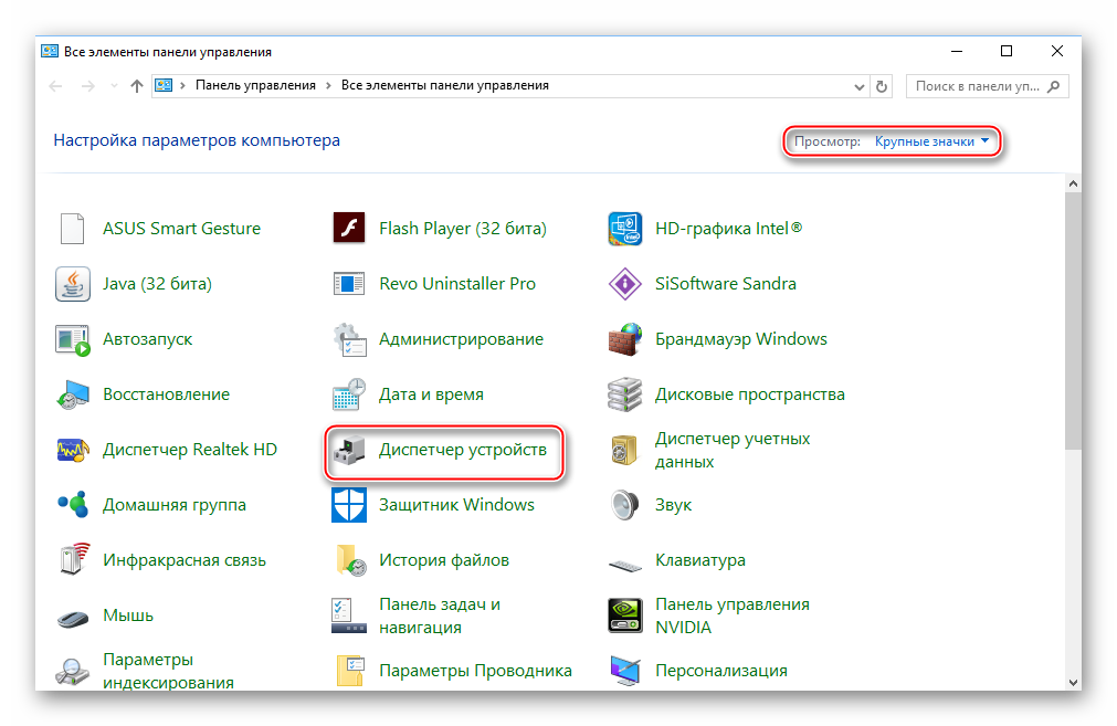 - Перейдите в «Панель управления» и в пункте «Просмотр» выберите «Крупные значки» или «Мелкие значки». Найдите в списке «Диспетчер устройств».