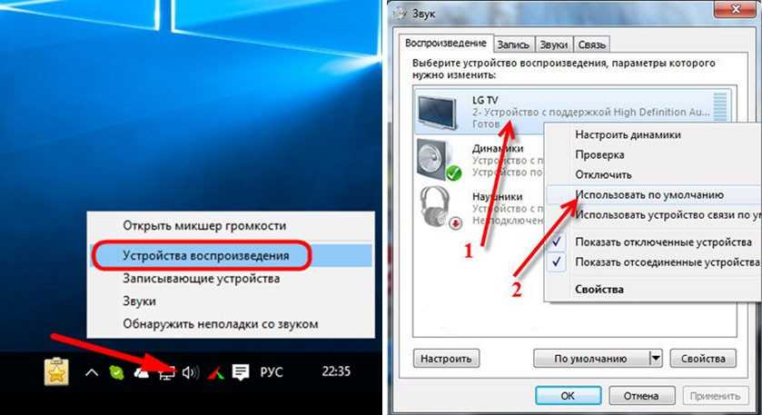 Причину того, что не идет звук, можно попробовать отыскать в настройках ОС Windows. У системы есть неприятная «особенность»: при перезагрузках, обновлениях или подключении нового оборудования она не всегда корректно выбирает устройство, куда будет передаваться аудиосигнал. Виндовс просто не знает, какое выбрать, особенно если их несколько. В таких случаях звук продолжает играть с колонок ПК, но не с динамиков ТВ.