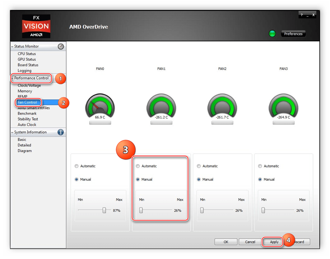 Если вы используете в своей системе процессор от компании AMD, то здесь настройка выполняется через специальную программу, функциональность которой сосредоточена именно на работе с данными ЦП. AMD OverDrive позволяет изменять скорость вращения вентилятора, а выполняются задача очень просто:
