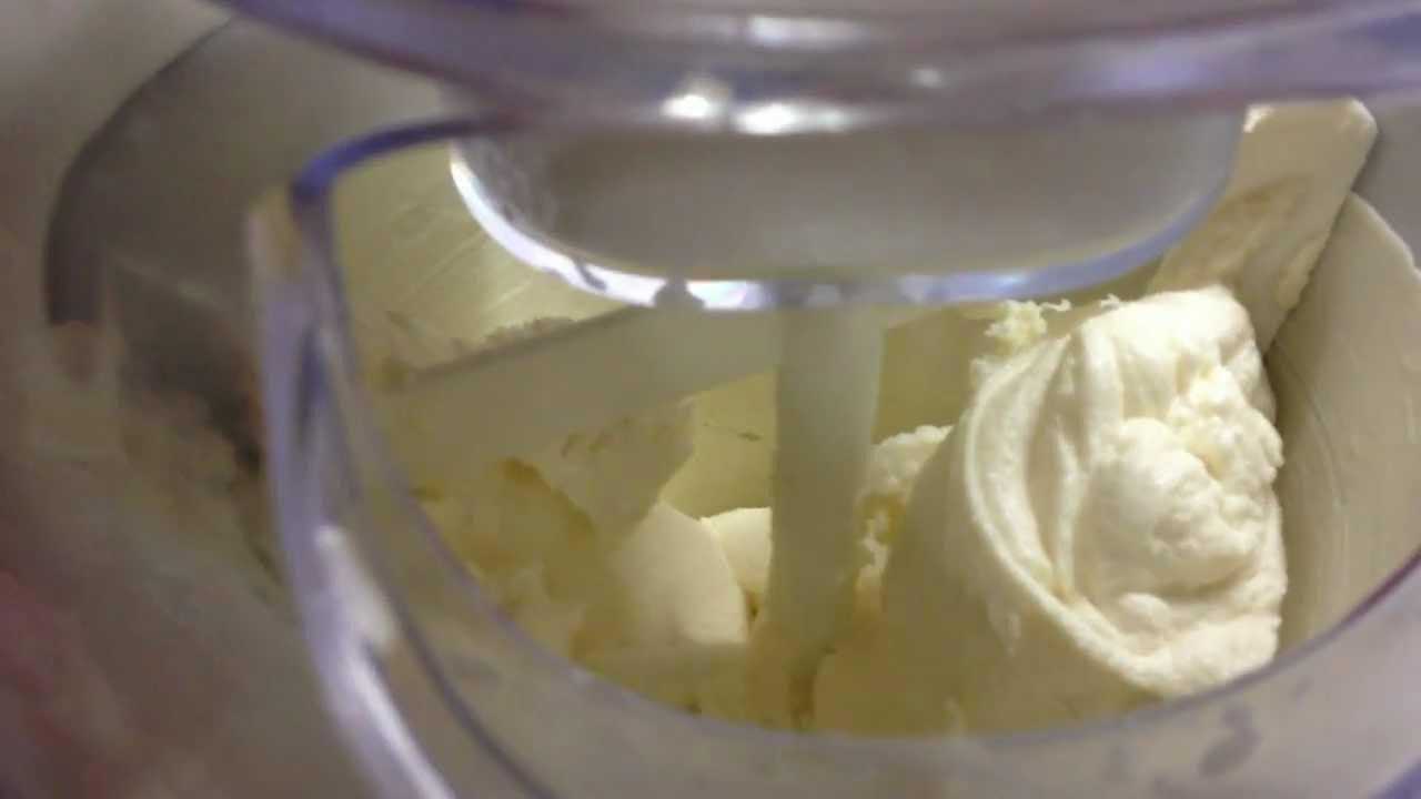 - налейте в чашу мороженицы сливки, и пусть аппарат взобьет их на небольшой скорости в плотную и мягкую пенку;
