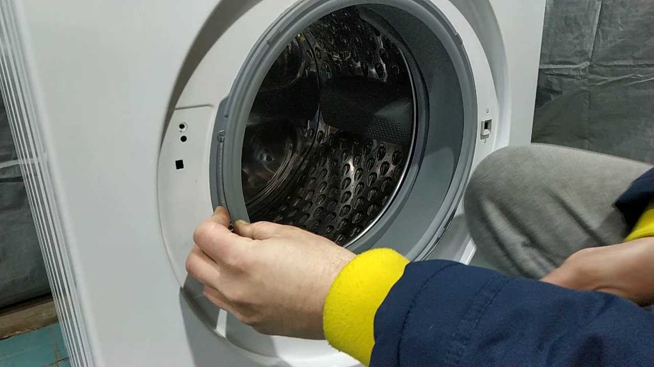 Демонтаж уплотнителя. Если открыть дверцу, можно обнаружить, что она соединена с резиновой деталью. Фиксирующее кольцо манжеты подцепляют плоской отверткой и слегка тянут на себя.За ним будет располагаться стягивающий металлический хомут в виде пружины. Нужно найти его защелку и разомкнуть ее с помощью плоской отвертки.