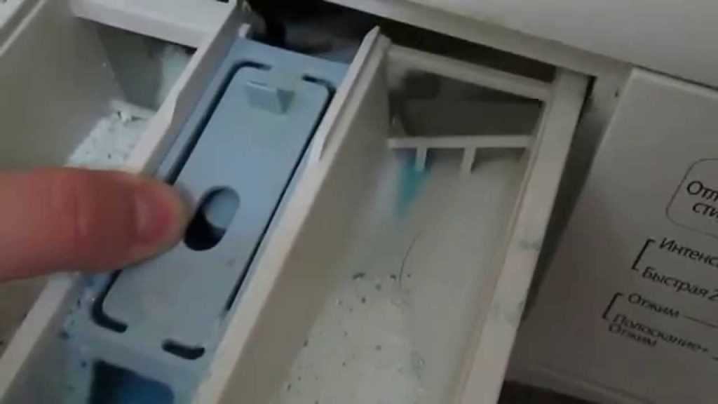 - Удалить выдвигаемый лоток, предназначенный для моющих средств. Для этого следует выдвинуть его и нажать на защелку, расположенную в средней ячейке лотка.
