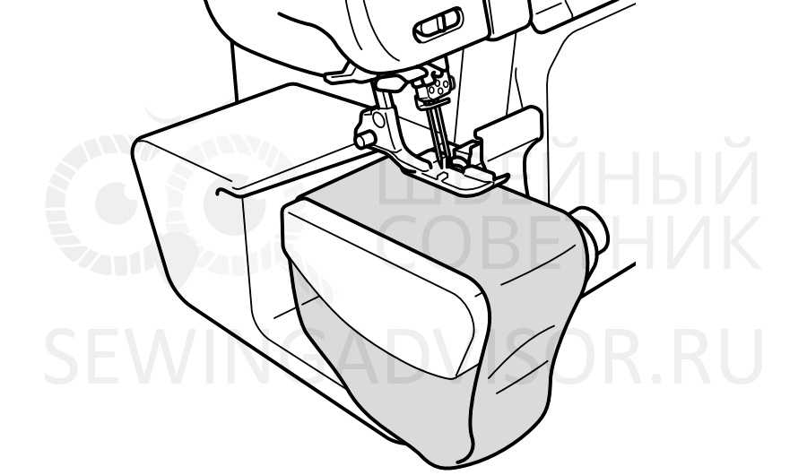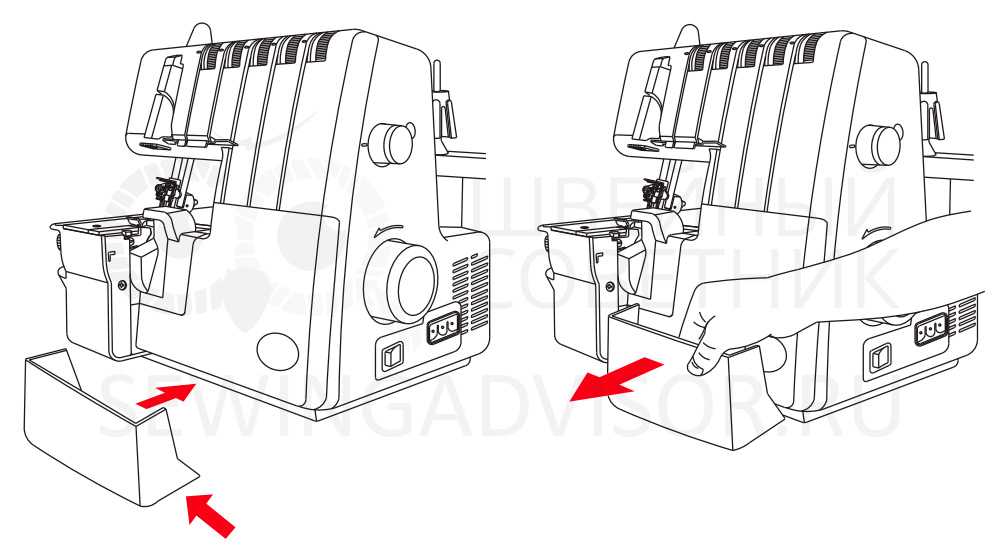 Лоток для обрезков крепится на передней панели оверлока. В нем собираются обрезки ткани после обрезания кромок. Рабочее место остается чистым.