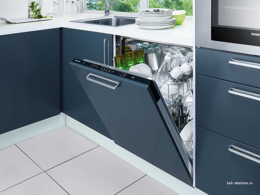 - посудомойка занимает место, причем достаточно приличное. Придется пожертвовать одной из зон хранения и продумать свободный доступ к дверце для ее открывания и закрывания;