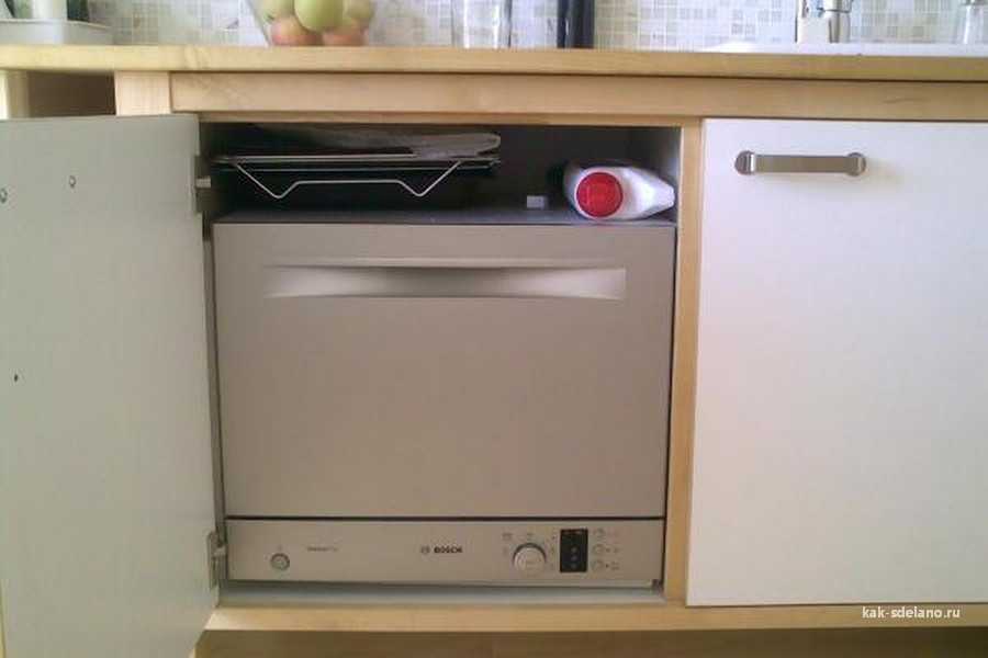 К невстройке относят и компактную посудомоечную машину, которую ставят на стол или в нишу пенала, как микроволновую печь. Такую посудомойку выбирают те, у кого совсем нет места для полноценного аппарата.