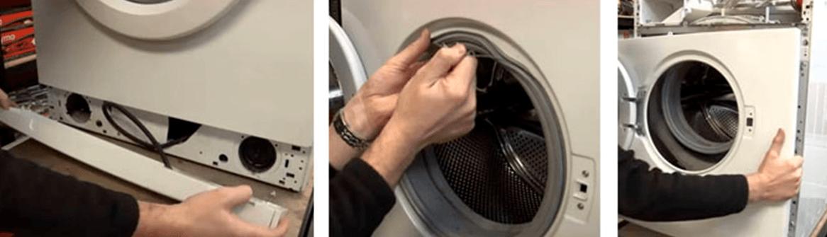 Как снять сервисную панель? Чтобы демонтировать сервисную панель, потребуется нажать одновременно на две замыкающих защёлки, а затем нажать и на третью, располагающуюся посерёдке. Как извлечь фронтальную стенку? Необходимо сначала убрать металлический хомут, который удерживает манжету люка. Манжета установлена в люке для загрузки. Закреплен металлический хомут посредством небольшой пружины. Её можно слегка подтолкнуть и хомут будет снят. Теперь можно затолкать манжету внутрь барабана.