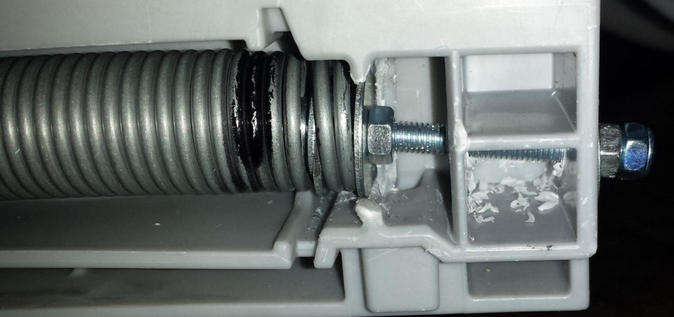 Как фиксируется дверь? При открытии петля натягивает трос, который в свою очередь оттягивает вниз металлическую пружину. Открывая, вы прикладываете усилие, натяжитель максимально оттягивает пружину, а блокиратор фиксирует ее в этом положении.