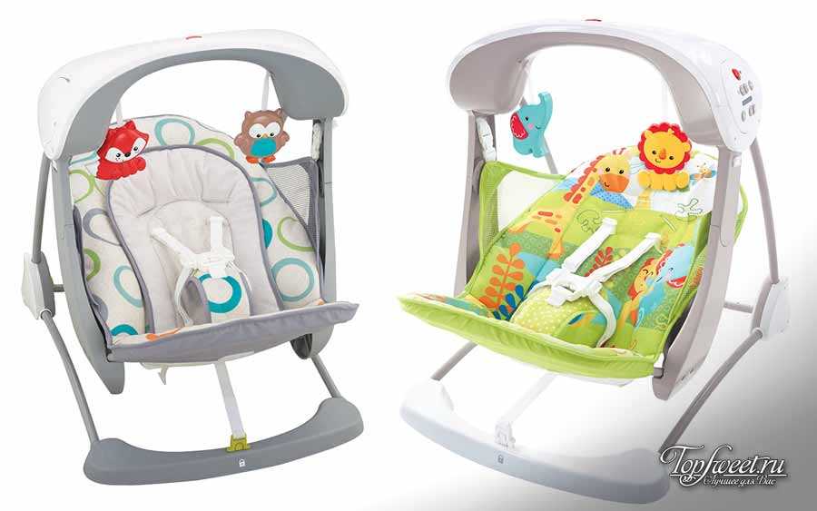 - Электронная качалка-колыбель Fisher Price Джунгли. Подойдет для ребенка от рождения и до 9 кг веса. Имеет 3 положения спинки и 10 мелодий, съемный чехол, 5-точечные ремни. Особенность – возможность менять направление укачивания: вперед-назад или влево-вправо. Для работы нужны батарейки, сетевого адаптера нет. Цену можно отнести к средним.