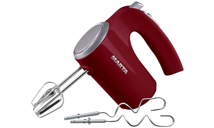 ТОП-12 ручных миксеров открывает модель бюджетного сегмента – Marta MT-1509. Мощность — 350 Вт: её хватает для стабильной работы на 5 установленных скоростях. Укомплектован 4 насадками — это крючки для замешивания теста, венчик для взбивания. Кнопка извлечения насадок упростит уход за техникой после окончания работы. Миксер выпускается в пяти цветах корпуса, не занимает много места, но всегда остаётся под рукой.