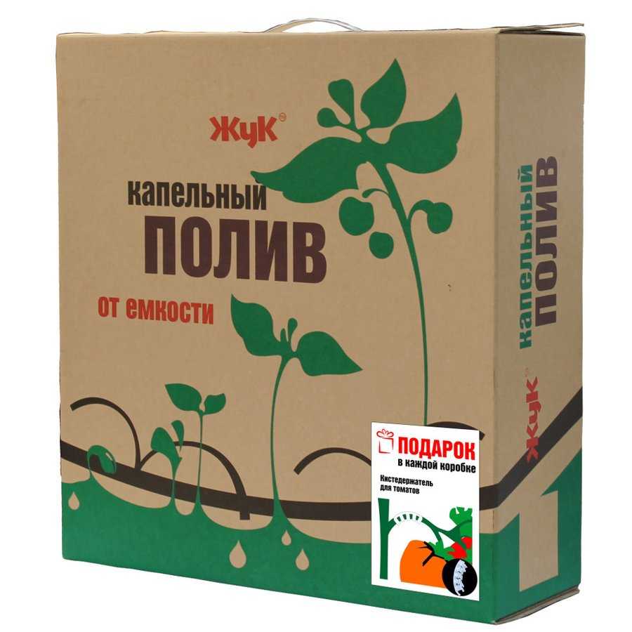 Расход у системы достаточно экономный – 4 литра на одну капельницу. В среднем уходит 240 литров за 1 час. В состав «Жука» также входит: штуцер для присоединения к емкости, капельницы, кран, подвес для трубки, фильтр для очистки и др.