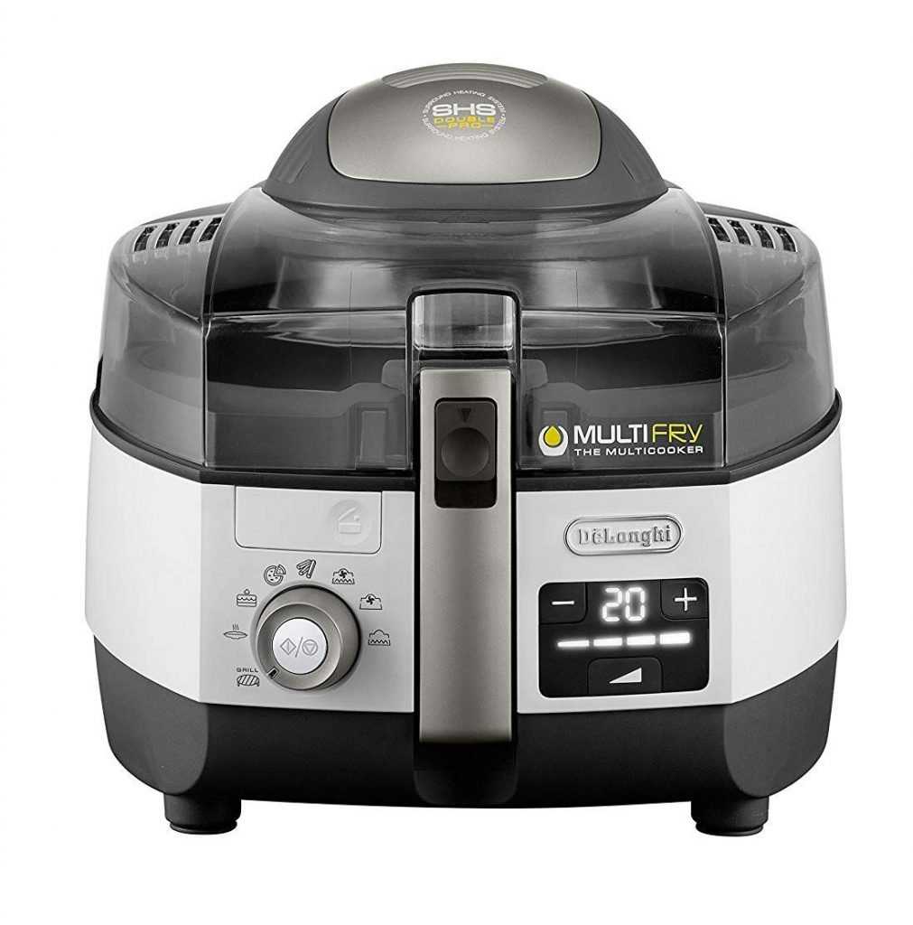 Более бюджетная мультипечь De’Longhi сочетает в себе функции аэрогриля и удобной аэрофритюрницы. Благодаря дополнительному фритюру пользователь может не только приготовить мясо или рыбу, но и подать к столу блюда, требующие особой прожарки: куриные ножки в хрустящей панировке, наггетсы или картофель фри. Однако система позволяет сделать эти лакомства более полезными, избежав обильного использования масла. Подобному процессу приготовления пищи способствует циркуляция горячего воздуха и равномерное прогревание решетки аэрофритюрницы. Модель от De’Longhi обладает меньшей мощностью, 1350 Вт, что делает ее более экономичной в употреблении электроэнергии. FH 1130/1 MultiFry компакта и весит всего 5 кг, но, как и аэрогриль от Philips, не позволяет изменять скорость конвекции, отсрочить старт таймера и недоукомплектована дополнительными аксессуарами.