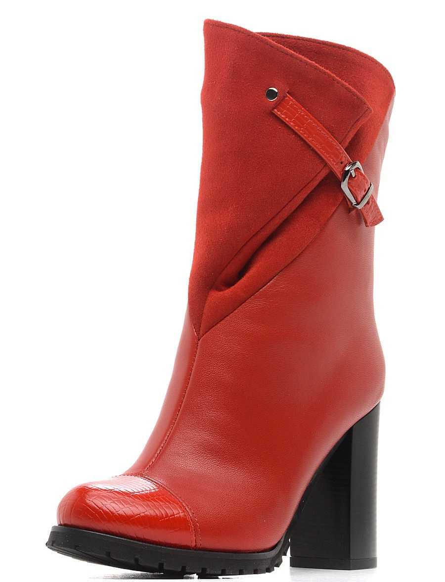 Замшевые полусапожки бордового цвета с декоративным отворотом вверху изделия. Внешняя часть верха изготовлена из натуральной кожи, в качестве внутренней подкладки выбрана натуральная овечья шерсть.