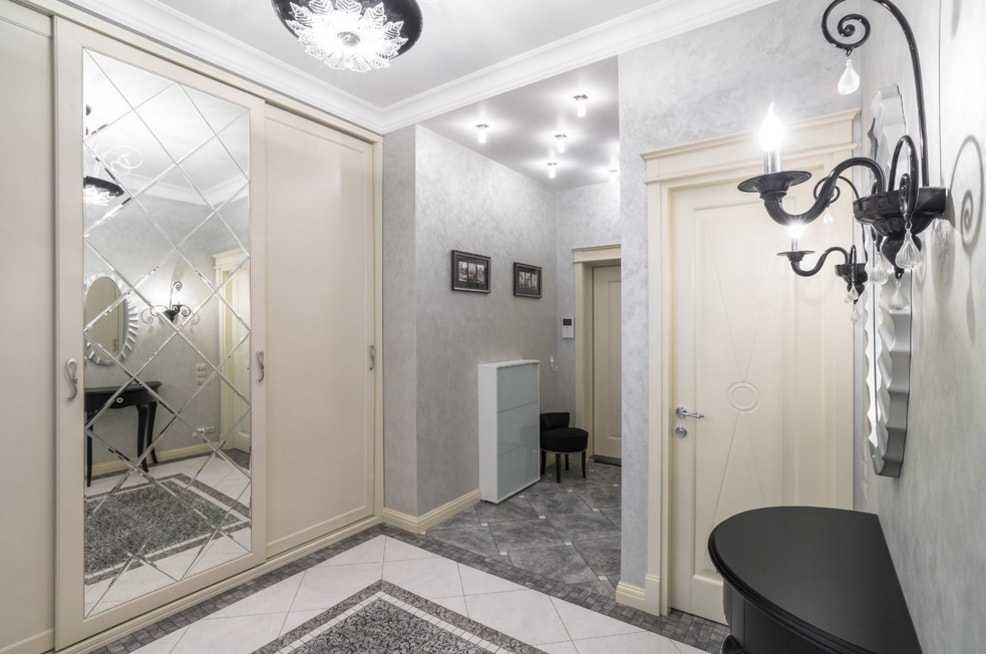 Шкаф в прихожей необходим для хранения крупной верхней одежды и обуви. Для экономии пространства можно выбрать шкаф-купе. Зеркало в пол будет помогать приводить себя в порядок перед выходом из квартиры.