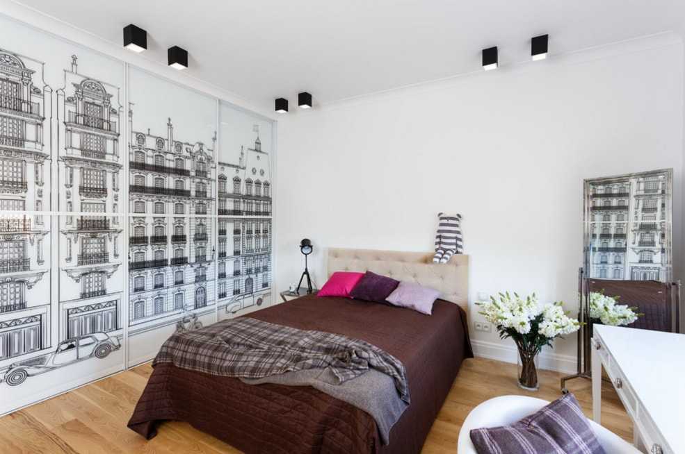 Популярностью пользуются также шкафы с зеркальными дверками. Зеркальная поверхность, украшенная изысканными узорами или даже принтами, смотрится стильно и позволяет даже визуально расширить пространство комнаты.