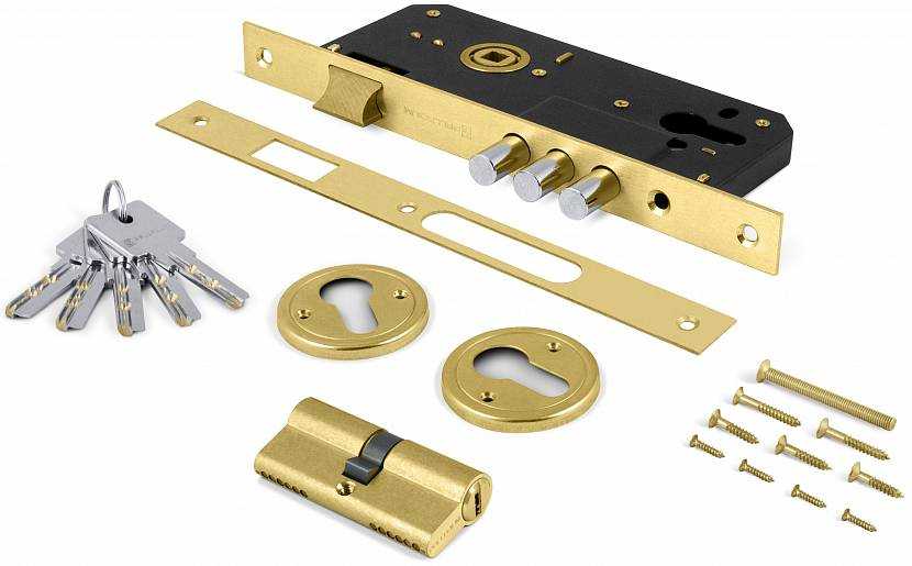 Процедура установки выполняется с внутренней стороны устройства из древесины. Прикрепление корпуса производится с применением шурупов, которые входят в комплект с замком. В корпусной части находятся специальные отверстия для крепежа. Так как запирающие ригели не передвигаются внутри полотна, а находятся в дверной коробке, то перед финальным монтированием необходимо проверить уровень надежности их хода.