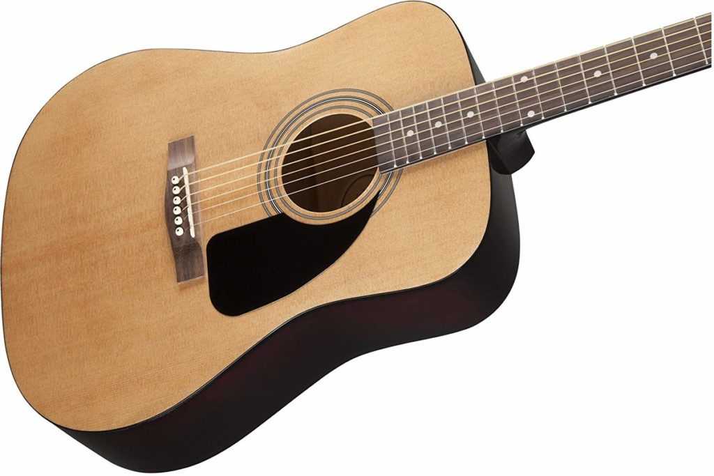 Эта недорогая акустическая гитара имеет ламинированную верхушку из ели и заднюю часть из красного дерева. Она больше, чем обычные модели, но отлично подходит для начинающих музыкантов.
