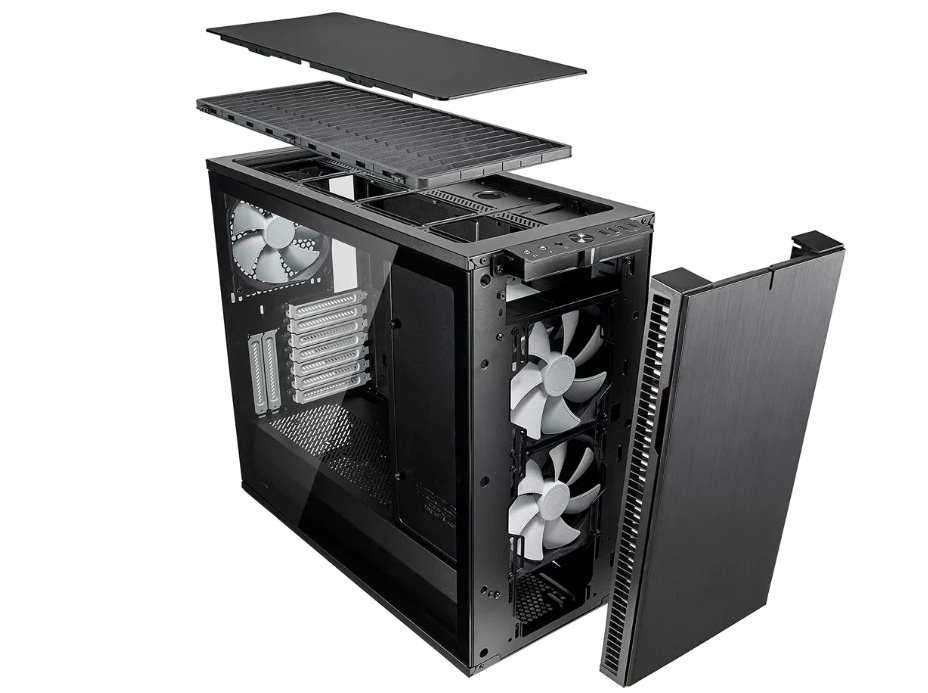 Чемпион нашего рейтинга, настоящий монстр с 12,5 кг чистого металла и стекла от Fractal. Это полноценный шедевр инженерной мысли с невероятно продуманной организацией внутреннего пространства, на создании которого не экономили ни копейки. Сталь — толстенная, фильтры и заглушки — везде, где только можно, о шумоизоляции и продуваемости не стоит и говорить. Модульная конструкция Define R6 позволяет поменять местами боковые панели и поместить внутрь любые представленные на рынке комплектующие, без оглядки на их размеры. Присутствуют 3 мощных предустановленных вентилятора и специальный хаб, с помощью которого можно подключить еще 9 кулеров не ограничиваясь возможностями мат.платы. Все слоты под накопители прорезинены, что предотвращает возможность появления паразитных вибраций.