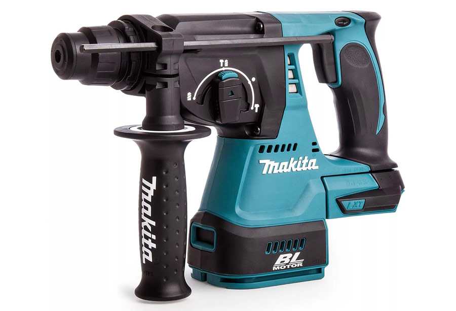 Один из лучших аккумуляторных перфораторов не только в нашем списке, но и на рынке – модель DHR242Z от бренда Makita. Он оснащён электронной регулировкой скорости вращения и прекрасной антивибрационной системой, а максимальная частота и сила ударов при работе в соответствующих режимах составляет 4700 и 2,0 Дж. Однако количество оборов на холостом ходу здесь не слишком велико – всего 950 в минуту