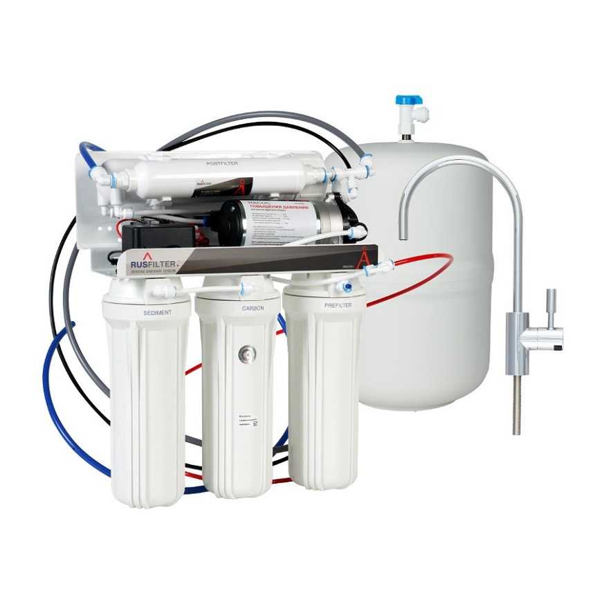 Доступная система обратного осмоса от российской фирмы с угольной фильтрацией и большим объёмом бака. Проточная модель занимает минимум места под мойкой, устанавливается без использования каких-либо специализированных инструментов и профессиональных навыков. Всё максимально просто и понятно: пользователи говорят, что с установкой разберётся даже ребёнок. Работает с водой температурой от 5 °С до 38 °С. Скорость фильтрации довольно высокая — 0.13 л/мин., шума в процессе обработки жидкости практически нет. В отзывах владельцы хвалят устройство за длительный срок службы без ремонта (минимум 5 лет), недорогие фильтры и чистую воду без примесей. Однако встречаются и жалобы на эту модель. Некоторым пользователям, несмотря на низкий процент брака, попадаются неисправные/повреждённые экземпляры.