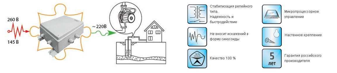 Имеющий хорошую защиту и надежность прибор с настенным креплением может применяться для питания электричеством водяных насосов на 220 вольт, погружных скважинных насосов, дренажных систем. Этот прибор дает возможность точного выравнивания напряжения и не допуская потерь в характеристиках параметров передавать на потребителя нагрузки.