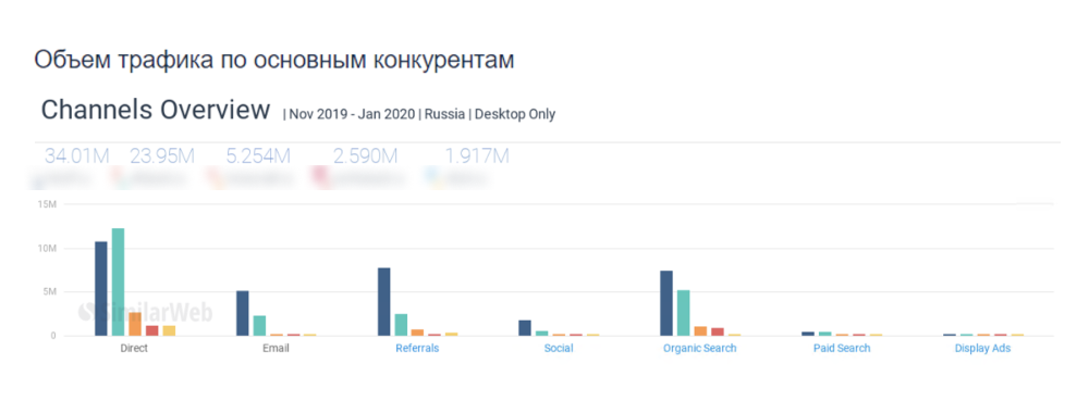 Оценить трафик на сайт. Это можно посмотреть на сервисах, которые оценивают трафик на сайтах, например Semrush и SimilarWeb. С их помощью мы увидим, какой объем органического и платного трафика у конкурента, источники этого трафика. Есть платные и бесплатные версии.