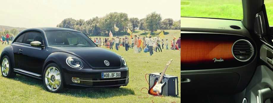 От режущих глаз дорогущих люксовых машин перейдем к чему-то попроще: например, к легендарному «Жуку». В США и Европу Volkswagen предлагает к покупке эксклюзивную модель Beetle Fender Edition (в России пока не заявлен, в США цена стартует с $24 440), которая является тем же Beetle, но с комплектной аудиосистемой, разработанной известным производителем усилителей и электрогитар. Его уже успели окрестить «музыкальным жуком» с логотипом Fender и различными «эксклюзивными» окрасками снаружи и изнутри.