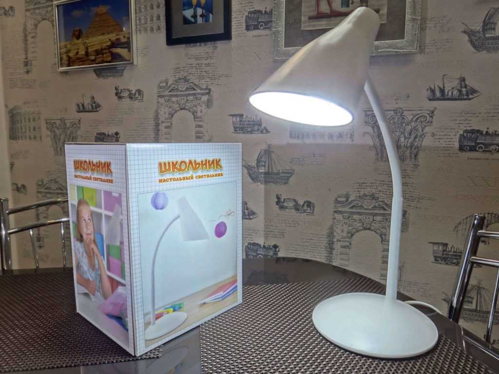 Светильник снабжён устойчивой подставкой и длинным гибким кронштейном. Он позволяет выбрать оптимальное направление света, обеспечивая высокий уровень комфорта при чтении, работе с компьютером, рисовании и многих других занятиях. Широкие нескользящие ножки также помогают ему сохранять стабильное положение даже на стеклянной столешнице. Современные LED-технологии уменьшают расходы двумя способами. Они не только снижают энергопотребление, но и продлевают срок службы устройства по сравнению со светильниками, оснащёнными лампами другой конструкции. Особенностью устройства также считается еще и то, что оно может работать как от электросети, так и от встроенного аккумулятора. Средняя стоимость: 576 рублей.