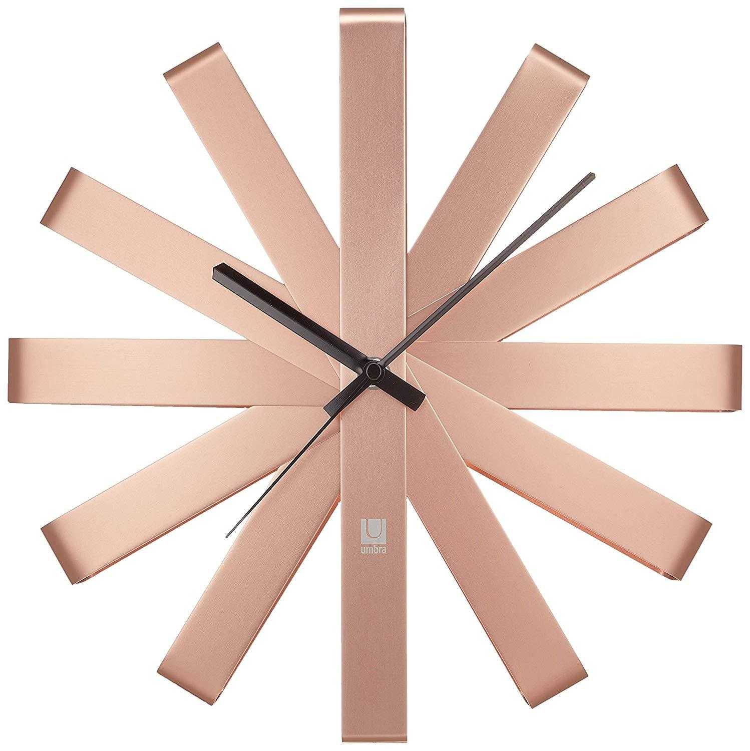 Интересный дизайнерский вариант в стиле бесшовный банд состоит из 6 длинных полос из металла шириной 2,2 см, выгнутых в замкнутую форму. Они соединены между собой посередине и образуют 12 концов, соответствующих 12 часам. Цифр нет. На полосе, соответствующей цифре 6 есть виден логотип компании. Стрелки для настенных часов выкрашены в красный цвет, кроме секундной, она — серая. Модель работает от 1 батарейки типа АА, которая входит в механизм, прикрепленный к задней части предмета интерьера. Без нее весит 614 г. Продавец выпускает часы в черном, сером, розовом и бледно-розовом цвете. Umbra Ribbon – стильный аксессуар для современного интерьера.