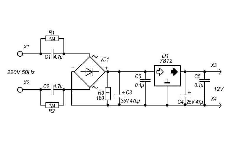 Помимо вышеприведенных методов чтобы получить 12 Вольт можно использовать схему с гасящим конденсатором.