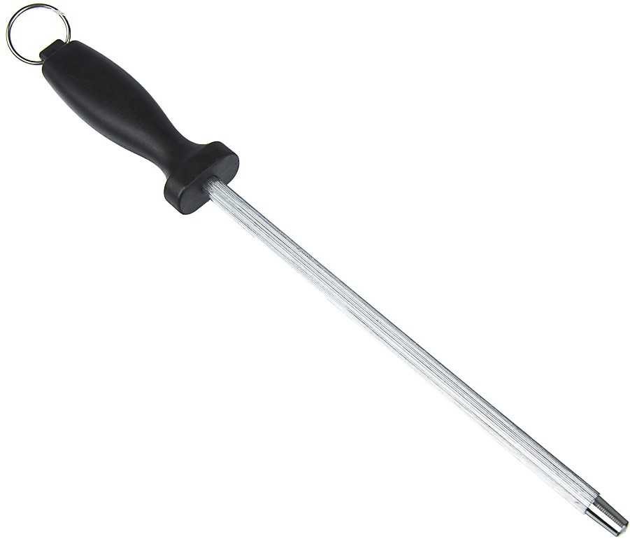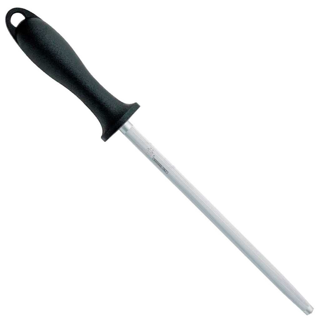 Стальной мусат получил круглую форму, на поверхности — насечки. Высокая степень закалки помогает достичь результата, не прикладывая больших усилий. Взаимодействуя наносит минимум вреда, оставляя после себя мелкую металлическую пыль. Подходит для правки режущих инструментов с твердость 58 — 59 единиц по Роквеллу. Ручка выполнена из термостойкого пластика. Ребристая поверхность предотвращает скольжение.