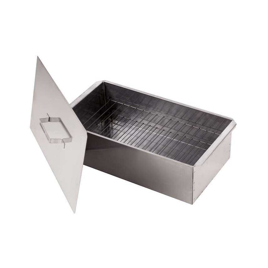 В самом приспособление есть 2 яруса с решетками из нержавейки, большой поддон в целях стекания жиров. Под ним располагается нагревательный элемент, куда будет подаваться древесная стружка.