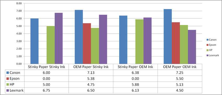 К сожалению, бумага Inkrite сторонних производителей не проходит через некоторые модели принтеров Epson, включая Stylus SX235W, который мы использовали, поэтому мы смогли получить результаты только для отпечатков Epson и Stinky Ink на собственной глянцевой бумаге Epson Premium Glossy. Они прошли среднюю оценку, и мы ожидаем, что принтер достигнет аналогичных оценок на качественной бумаге сторонних производителей, но не на бумаге Inkrite.