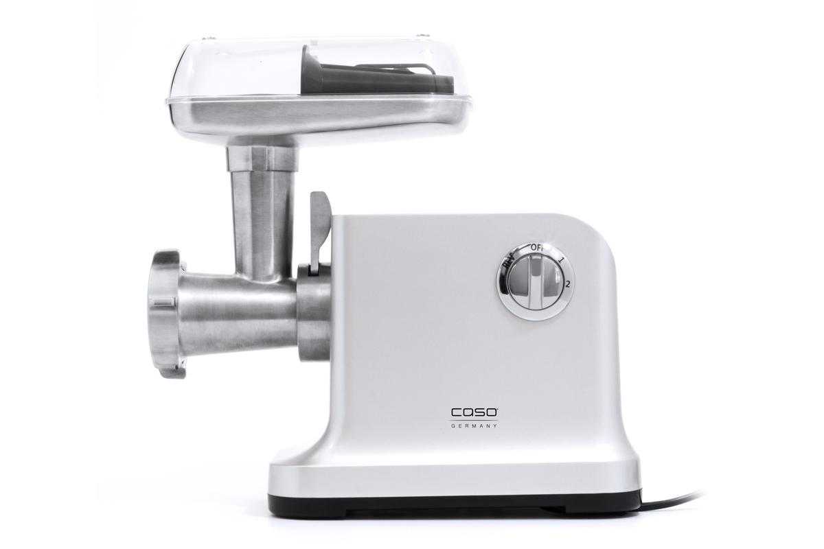 Рейтинг мясорубок 2021 года пополняет цельнометаллическая модель CASO FW 2000, получившая много положительных отзывов от экспертов. Сбалансированная модель с мощностью в 2000 Вт имеет прочный и удобный корпус, легко очищается от загрязнений и дополняет любой дизайн интерьера. К достоинствам прибора следует отнести оптимальный набор функций для комфортной работы в домашних условиях: реализовано два скоростных режима, есть опция реверса. Комплектация включает сразу три прочные решетки для фарша, имеющие разный диаметр. Есть насадки для готовки колбасок, печенья и кеббе. Стоит отметить хороший металлический лоток. Смущает только не слишком удобный толкатель, но это небольшой нюанс.