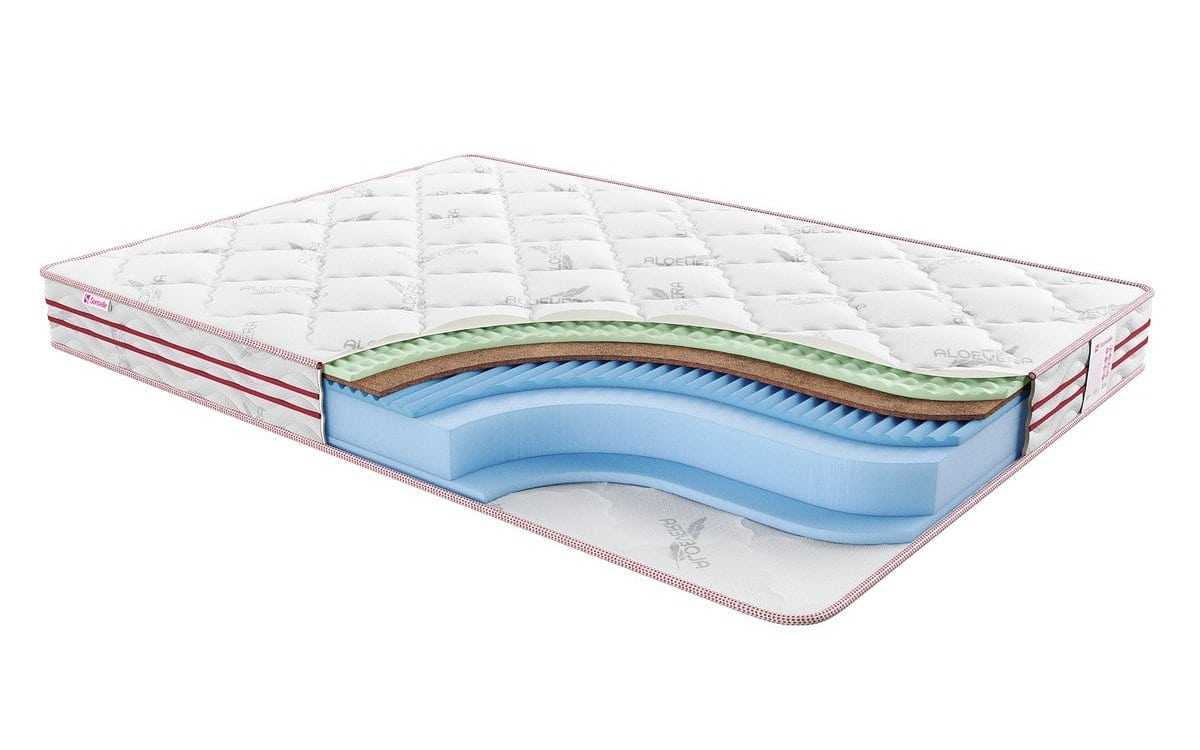 Матрас высотой 19 см состоит из комбинации высокотехнологичных пен, экопены и койры кокоса. Сочетание искусственных материалов RelaxFoam и WaveFoam создает упругую поддержку спины и приятный массажный эффект. А кокосовый слой покрыт искусственным латексом, поэтому на нем комфортно спать, он помогает распределять вес до 120 кг равномерно по всей поверхности.