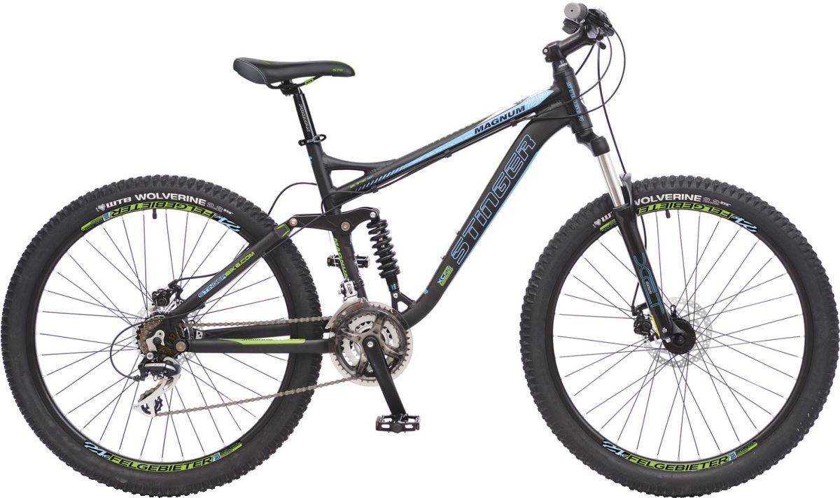 Велосипед Stinger Magnum 27.5 также входит в рейтинг наиболее популярных байков с 2 амортизаторами. Эти двухподвесные транспортные средства изготовлены из алюминия, ход амортизатора в 100 мм способствует комфортному преодолению препятствий на дороге и отлично справляется с бордюрами. Лучший разгон и высокую скорость обеспечивает наличие блокировки подвески на велобайке. Возможность выбора любой из 21 скорости дает возможность комфортно преодолевать почти любые препятствия.