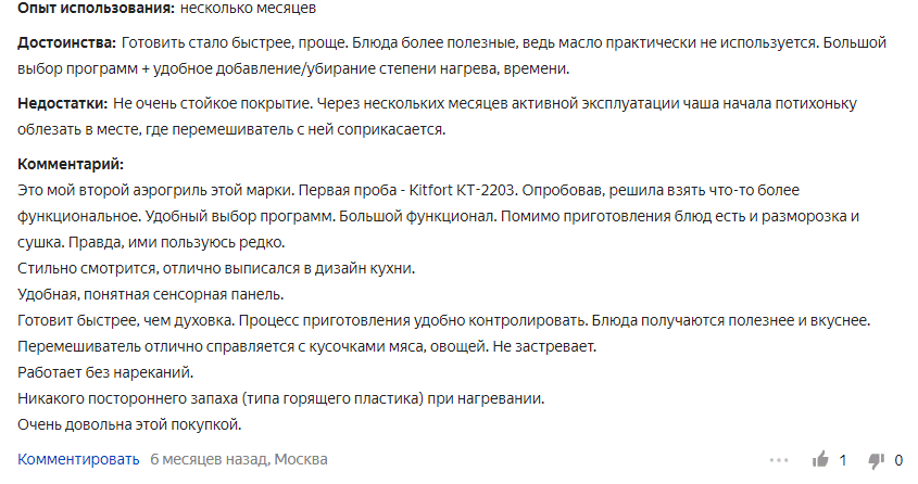 На первом месте в рейтинга стоит новинка от Kitfort модель КТ-2218. Аэрогриль с уникальной конструкцией корпуса. Он предусматривает наличие механизма, который позволяет наклонять чашу в одну и другую сторону. Это способствует перемешиванию продуктов в чаше, чтобы обжарка или тушение происходили более равномерно.