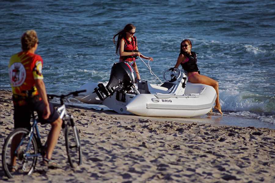 Но уже начиная с 3,3-метров появляются модели с центральной консолью (вроде Brig Falcon 330), на которых управление и контроль газа переведены на отдельную панель со штурвалом. Система электрического запуска появляется на моторах мощностью от 20 л.с.